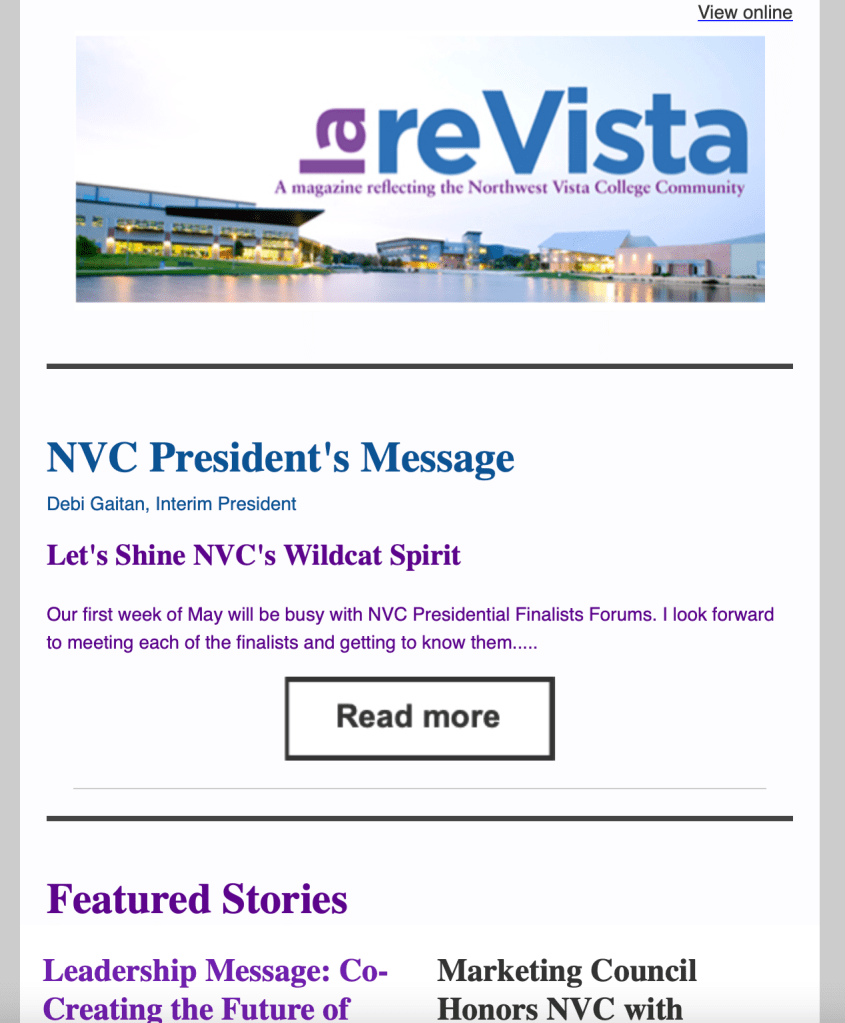 I write, edit and load stories in the magazine twice a month and produce nine issues each semester. After an issue is completed, I email the NVC community with an eye-catching email to let them know new stories are available to read.
